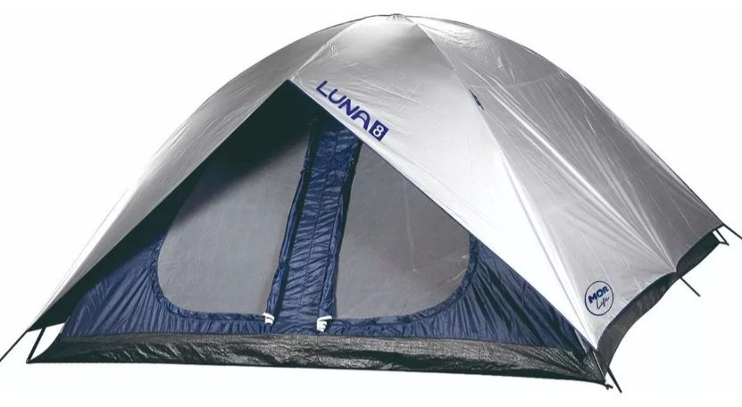 A Barraca Luna para 8 pessoas é tudo que os clientes estavam esperando. Esta barraca é ideal para uma família grande ou um grupo de amigos, pois é possível dividi-la em dois quartos. Ela tem cinco portas, duas na frente, duas atrás e uma entre as divisórias. Possui 3,50m x 3,50m de área e 1,80m de altura, bastante espaço para quem quer acampar com conforto. Moderna e segura, a Barraca Luna vem com uma proteção extra contra vazamentos: o sobreteto vai até o chão e é inteiramente revestido em silvercoating (material prata) que, além de deixar a barraca mais bonita, reflete a luz solar, diminuindo o calor no seu interior. Além disso, apresenta mosquiteiro na porta, no teto e na janela traseira e local para pendurar lanterna dentro da barraca.