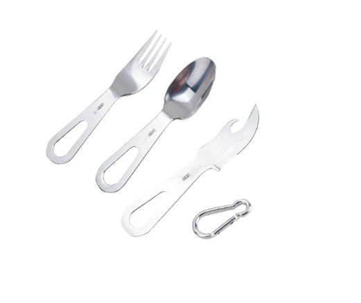 O Kit Azteq Jamboree acompanha 1 colher, 1 garfo, 1 faca com abridor de lata, mini-mosquetão.
