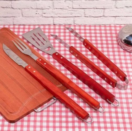 Kit para Churrasco com Lâmina em Aço Inox e Cabo de Madeira . Um item prático e bonito, produzido em aço inox e cabo de madeira, que garantem alta resistência e segurança.